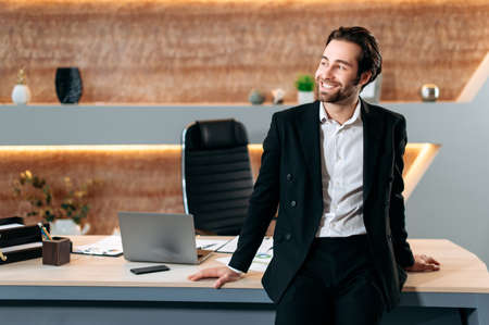 Positive professional successful caucasian executive, business leader, ceo of the company, in a stylish business suit, stand near his desk in a modern office, look aside, smiling happily