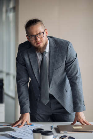 confident strict bearded red-haired businessman is leaning on the table and looking at camera. boss giving directions to colleagues. leader in stylish grey suit standing at table and making report