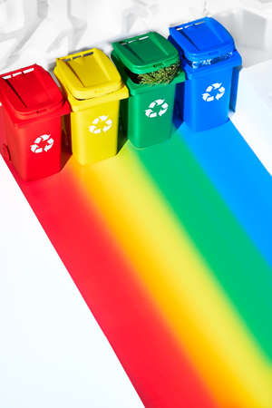 Four color coded recycle bins, isometric projection on geometric rainbow paper background with copy-space. Recycling sign on the bins - red, blue, yellow, green. Waste separation concept background.