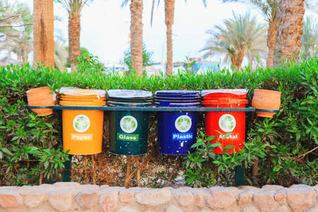 Camyuva, Turkey - 08.30.2021: Row of trash cans for sorted garbage to recycling. Environmental conservation problems.