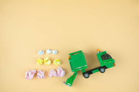 Green plastic garbage truck with colorful crumpled paper balls. The concept of uniqueness. Minimalist business recycling