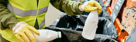A young volunteer in gloves and a safety vest holds a plastic bottle, promoting eco-conscious actions.