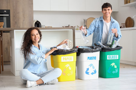 Young couple with garbage containers sorting rubbish in kitchen. Recycling concept