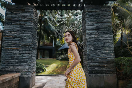 Beautiful young caucasian woman walking in a tropical park near the arch of wild stone. Vacation in the tropics concept. High quality photo