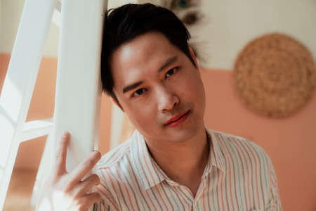 Happy Asian gay leaning at the pole of bunk bed with eyes closed and look at the camera.