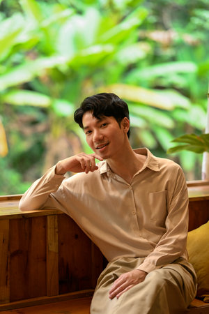 A man sits comfortably indoors, leaning on a wooden ledge, with a soft smile and lush greenery visible through the windows in the background.