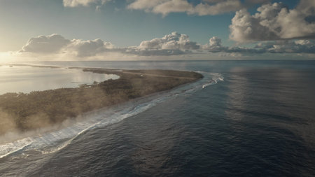 Generative AI Aerial view of stunning atolls, warm sunset glow, crystal-clear waters, detailed drone-captured French Polynesia at dusk