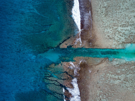 Aerial view of beautiful tropical beach with turquoise water and coral reef