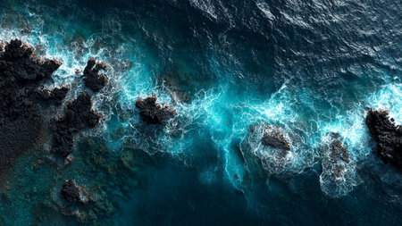 Aerial view of ocean waves breaking on rocky shore. Top view