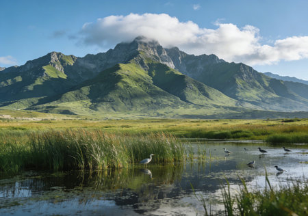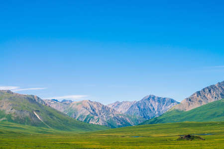 Giant mountains with snow above green valley under clear blue sky. Meadow with rich vegetation and lakes of highlands in sunlight. Amazing sunny mountain landscape of majestic nature.