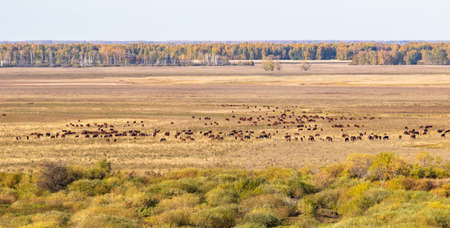 Cows on a pasture, dry yellow grass in the fall.