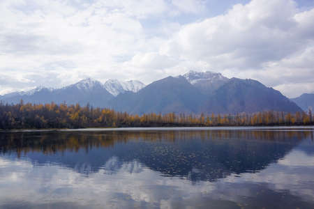 Autumn forest reflected in Kanas wolong bay, xinjiang