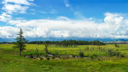 Picturesque green valley in sunlight against snowy mountain range under cloudy sky on summer or autumn day. Beautiful panorama of the Altai mountains, Siberia.