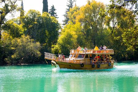SIDE, TURKEY - MAY 02, 2019: Tourist ships on the Manavgat River in Side, Turkey
