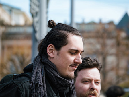 A trendy long hairstyle tied back into a man bun, emphasizing the contrast between casual and sophisticated, set against a blurred urban backdrop