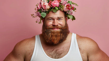 A happy plus size man with a red beard smiles at the camera while wearing a white tank top and a floral crown against a pink background.