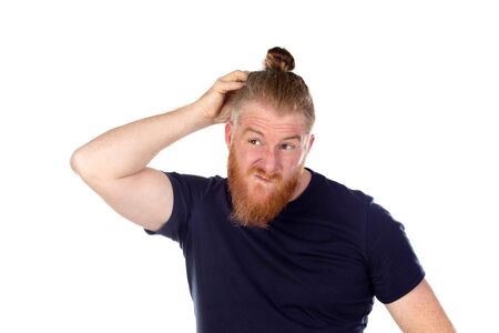 Hairstyle on the head of a man, sloppily collected hair, a view from behind a man's hairstyle, a pigtail on his head, a bearded hipster in the mountains. high quality photo
