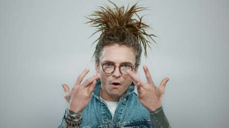 Side portrait of young guy with hair bun wearing eyeglasses on grey background.