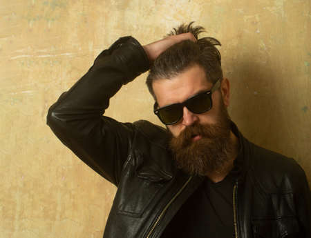 Men's fashion and beauty. Portrait of a handsome brutal man with a beard and mustache posing in a stylish shirt and leather jacket against a brick wall background.