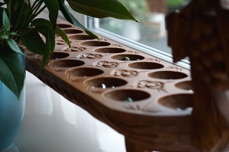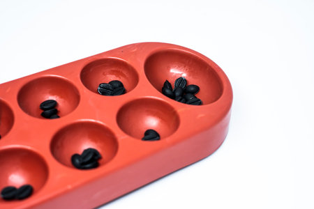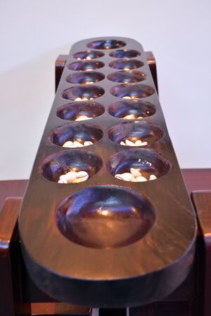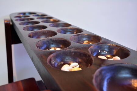 Close-up of a congkak or congklak which is a mancala game of Malay origin played in Malaysia, Philippines, Singapore, Indonesia, Brunei and Thailand