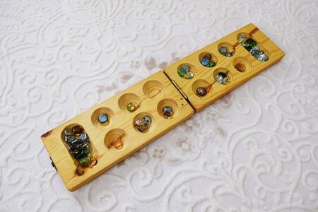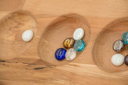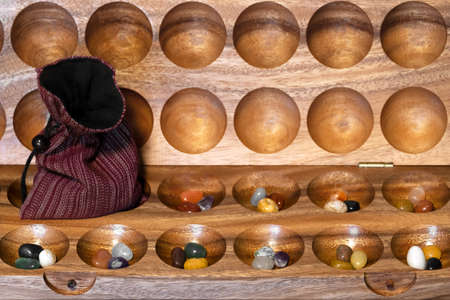Mancala board game of semi-precious stones close-up,playing surface with holes,3 stones in each,fabric sack. Traditional national family games for adults,children in Asia and Africa for 2 players