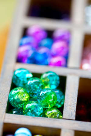 A portrait of a lot of different marbles in different colors, lying on a wooden roster casting a colorful reflection on to the wooden surface.