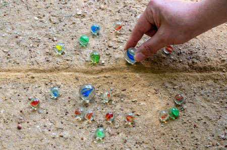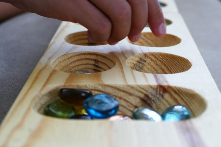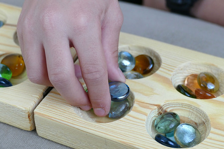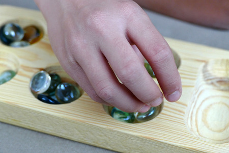 close up hand hold glass ball in kalaha game for practice math and strategic thinking