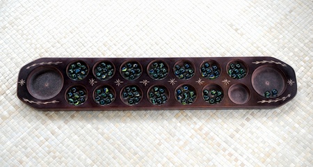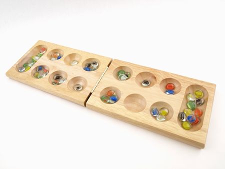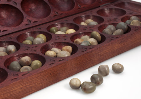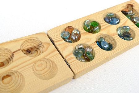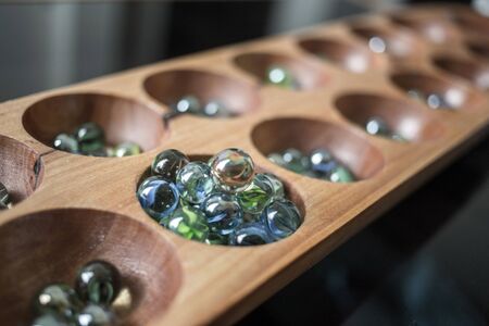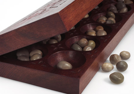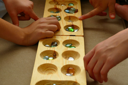 wooden mancala and stones, playing intelligence and mancala. intelligence mancala game,