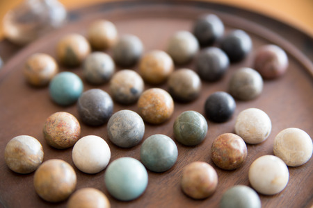 Traditional Mancala boardgame with glass pieces on rock path outside