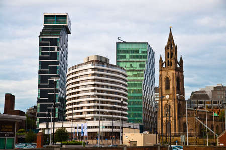 Modern houses and a church in Liverpool