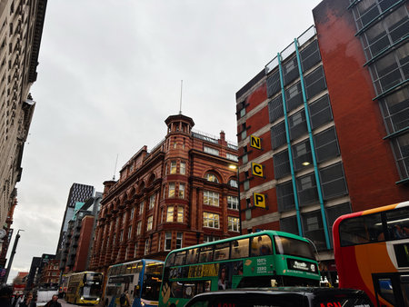 Manchester, UK - November 27, 2025: Bustling urban scene in Manchester featuring historic architecture and colorful buses under gray skies.