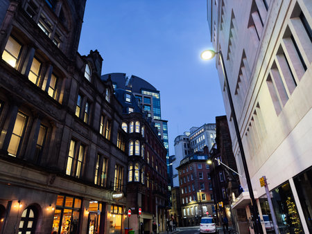 Manchester, UK - December 10, 2025: Evening in Manchester city center with illuminated windows and varied architecture.