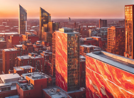 Vibrant Sunset Over Urban Skyline Featuring Unique Architectural Designs in City Center