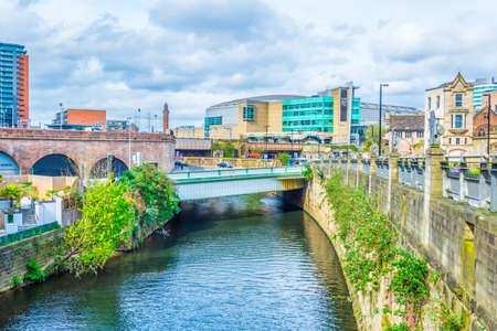 MANCHESTER, UK - APRIL 21, 2013: Manchester urban skyline with River Irwell and Albert Bridge. Riverside architecture.