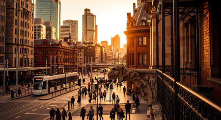 Manchester, UK - December 10, 2025: Bustling Manchester street with tram lines, modern glass towers, and ornate red brick buildings.
