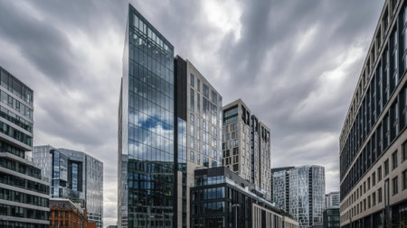 Low-angle shot of modern buildings with glass and brick facades under a cloudy sky