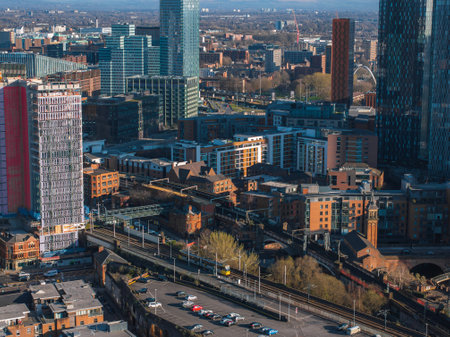 Aerial View of Manchester Skyline with Skyscrapers and Railway Line