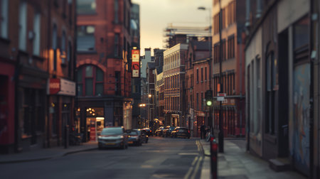 Manchester, UK - November 17, 2025: A busy Manchester Portland street scene with a long red brick building, traffic and pedestrians under a clear sky.