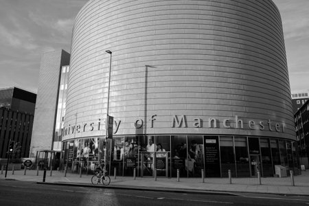 Manchester, United Kingdom - July 25, 2018: A cyclist passes by the large, drum-shaped building of The University of Manchester, University Place, on Oxford Road in Manchester.