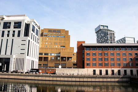 Manchester, United Kingdom - April 24, 2019: View of modern architectural buildings at the Salford Quays on the banks of the Manchester Ship Canal in Salford and Trafford, Greater Manchester