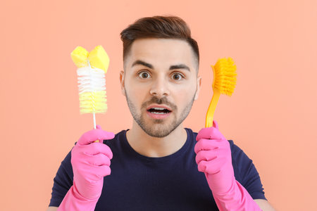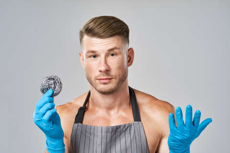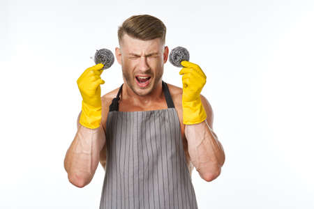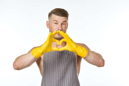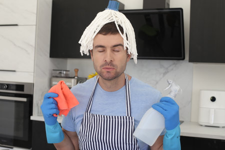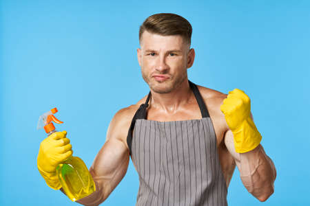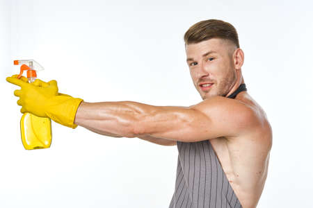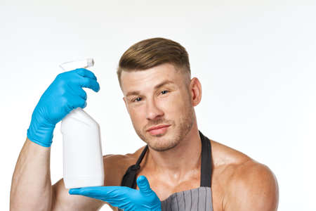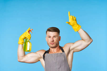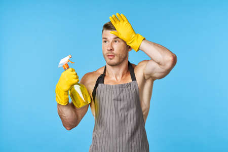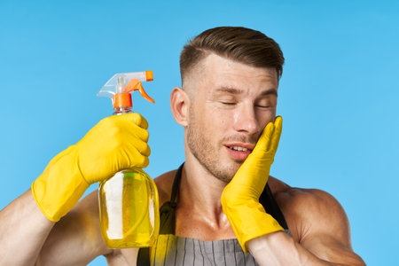 Getting ready for house cleaning: A man in a gray apron ready cleaning supplies, including bottles and rubber gloves. The scene exudes cleanliness