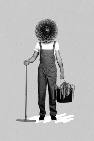 Composite collage photo of young headless worker housecleener gardener man hold swabber with bucket flowers isolated on blue color background