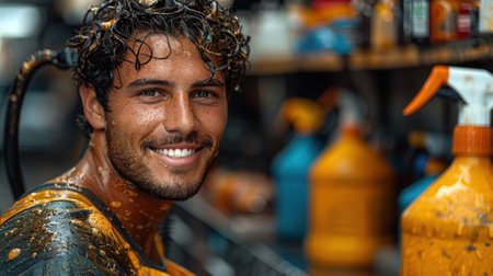 Young man smiles broadly, covered in soap and water, with droplets on his face and clothes.
