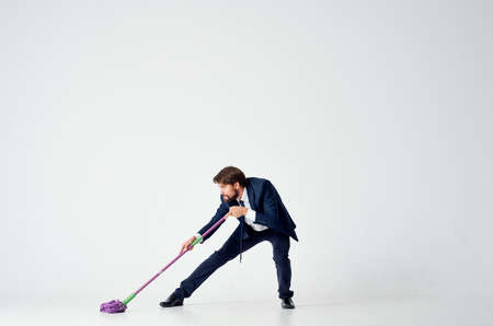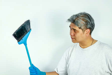 House cleaning. Broom. Bearded man with broom. Cleaning and disinfection. Professional cleaning. Cleaning service. Clean up. Clearing tools. Household. Housekeeping. Besom