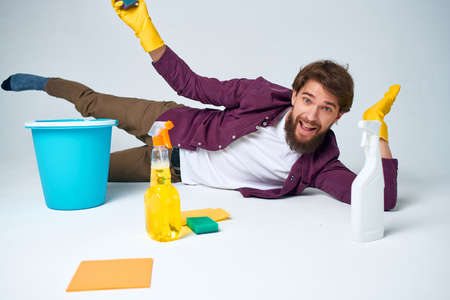 Man in yellow rubber gloves detergent housework rendering services close-up