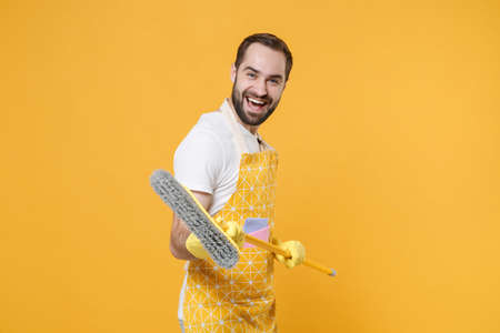Crazy screaming young man househusband in apron rubber gloves hold broom while doing housework isolated on yellow wall background studio portrait. Housekeeping concept. Mock up copy space. Jumping.