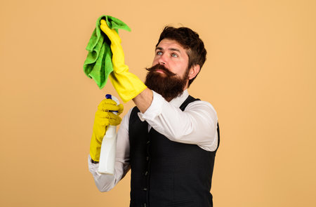 Professional cleaning service. Bearded man with cleaning supplies. Male cleaner worker in rubber gloves with rag and detergent. Housekeeper in uniform with spray and rag. Housework and housekeeping