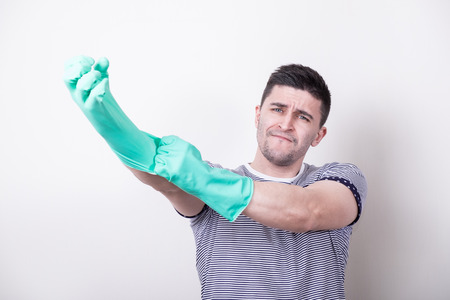 emotional man wearing rubber gloves detergent cleaning housework cropped view