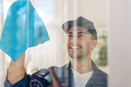 Focused worker in uniform using a squeegee to clean large office windows, highlighting expertise in maintenance and cleanliness