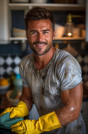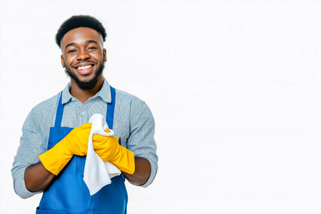 A young man wearing yellow gloves stands confidently with a cloth in his hand, ready to clean. Bright sunlight streams in, highlighting his cheerful expression and the clean environment. Copy space.